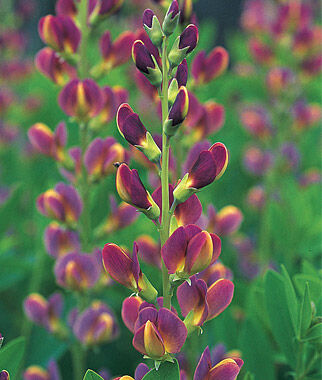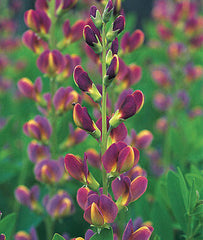 May through mid-June, this beauteous baptisia, bred at the Chicago Botanic Garden, is blanketed with hundreds of bicolor blooms. Eye-catching, sense-drenching purple-violet flowers with lemon-yellow center keels are complemented by attractive blue-green foliage. Vigorous, bushy 4-5 ft. tall plants serve well in a border, or as an edging. Plants thrive in full sun and well-drained soil. U.S. Plant Patent #19,011.