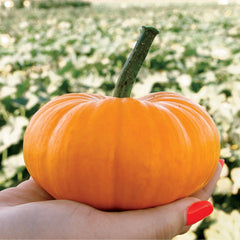 This novelty baby pumpkin has a semi bush plant habit with great yield potential. This little space saver has a strong dark green handle. A beautiful dark orange color contrasts against a dark green handle making this perfect for any fall decoration. Very productive and adds to an attractive display. This small ornamental pumpkin is great for crafts and decorating!